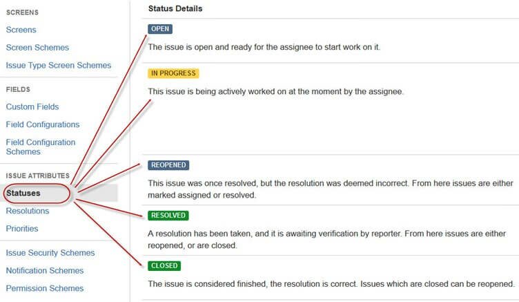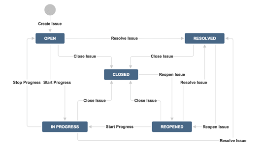 Различные статусы используются, чтобы обозначить прогресс проекта: Ожидает выполнения (To do), Выполняется (InProgress), Открыт (Open), Закрыт (Closed), Переоткрыт (ReOpened), Решен (Resolved). Также имеются решения и приоритеты. Решения обозначают прогресс выполнения задачи: Исправлено (Fixed), Не будет исправлено (Won’t fix), Дубликат (Duplicate), Не завершено (Incomplete), Не воспроизводится (Cannot reproduce), Выполнено (Done). Также вы можете указать приоритеты задач: Критический (Critical), Высокий (Major), Малозначимый (Minor), Блокирующий (Blocker) и Тривиальный (Trivial).