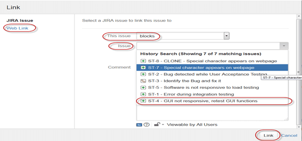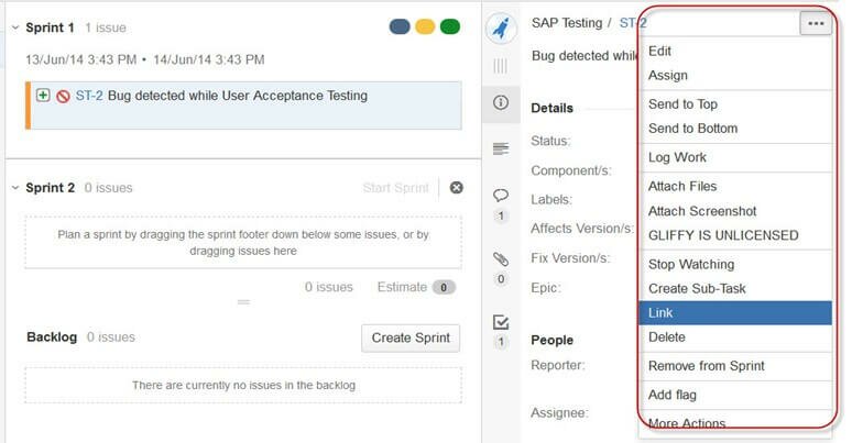 Помимо этого в JIRA есть такая полезная функция, как «Связывание» (Link). Связывание задач, что понятно из названия, позволяет создавать связи между существующими задачами на этом же или другом сервере JIRA. Как показано на скриншоте, мы связали задачу «ST-6 Выпадающее меню не работает» (ST-6 Drop down menu is not working) с другой «ST-4 Интерфейс не работает — необходим ретест функционала интерфейса» (ST-4 GUI is not responsive- retest GUI functions).
