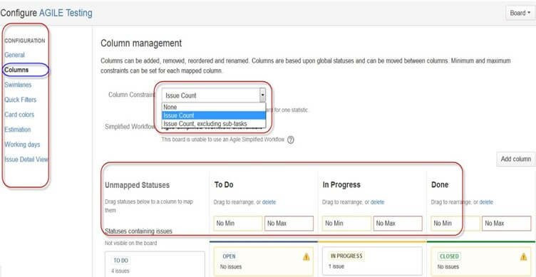 Вы также можете настроить то, как будет отображаться рабочая панель Scrum — для этого имеется множество опций. Элементы Scrum, которые можно настроить подобным образом, включают в себя: колонки (Columns), Swim Lane блок-схемы, быстрые фильтры (Quick Filters), цвета элементов (Card colors) и т. д. Здесь, например, мы выбрали управление колонками, а для типа отображаемой информации указали «Подсчет задач» (Issue count), что позволило нам увидеть точное число задач, находящихся в процессе выполнения, выполненных и ожидающих выполнения. Помимо этого можно выбрать множество других типов колонок, которые будут отображать ту информацию, которая вам необходима.