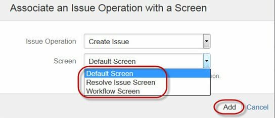 Если задача создана в JIRA, она будет организована и представлена на различных рабочих пространствах, которые называются экранами. Эти рабочие пространства могут переводиться и редактироваться в ходе рабочего процесса. Как можно увидеть на скриншоте, каждой задаче вы можете назначить тип экрана. Чтобы ассоциировать осуществление задачи с определенным экраном, нужно зайти в главное меню, кликнуть Задачи (Issues), кликнуть Схемы (Schemes), после этого кликнуть Ассоциировать осуществление задачи с экраном (Associate an issue operation with a screen) и добавить экран, соответствующий требованиям.