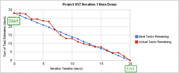 Для отслеживания прогресса в Agile существует диаграмма сгорания задач (Burndown Chart), отображающая выполненный и запланированный объем работы, необходимый для завершения спринта. Типичная диаграмма будет выглядеть примерно так же, как на скриншоте ниже. Красная линия отображает фактический объем выполненной работы, в то время как синяя отображает идеальный объем выполненной на протяжении scrum-цикла работы.